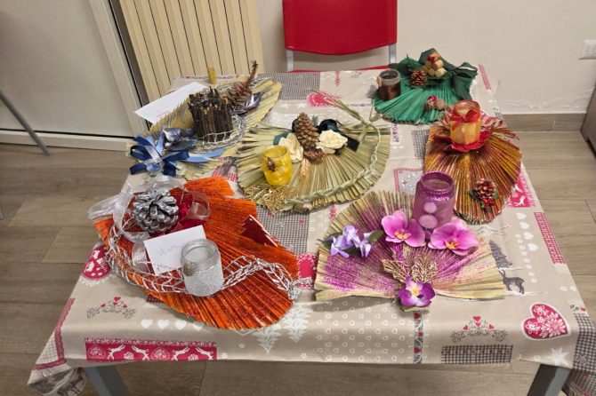 I nostri ospiti e i tecnici della riabilitazione psichiatrica hanno lavorato insieme per creare manufatti unici con materiali riciclati ed elementi provenienti dalla natura. Grande la varietà dei prodotti: decorazioni natalizie, portacandele con pietre e conchiglie, centritavola realizzati su foglie di palma, braccialetti con i charms portafortuna, palle di natale rivestite di lana lavorata all’uncinetto, appendini di  pannolenci e di pasta di sale.